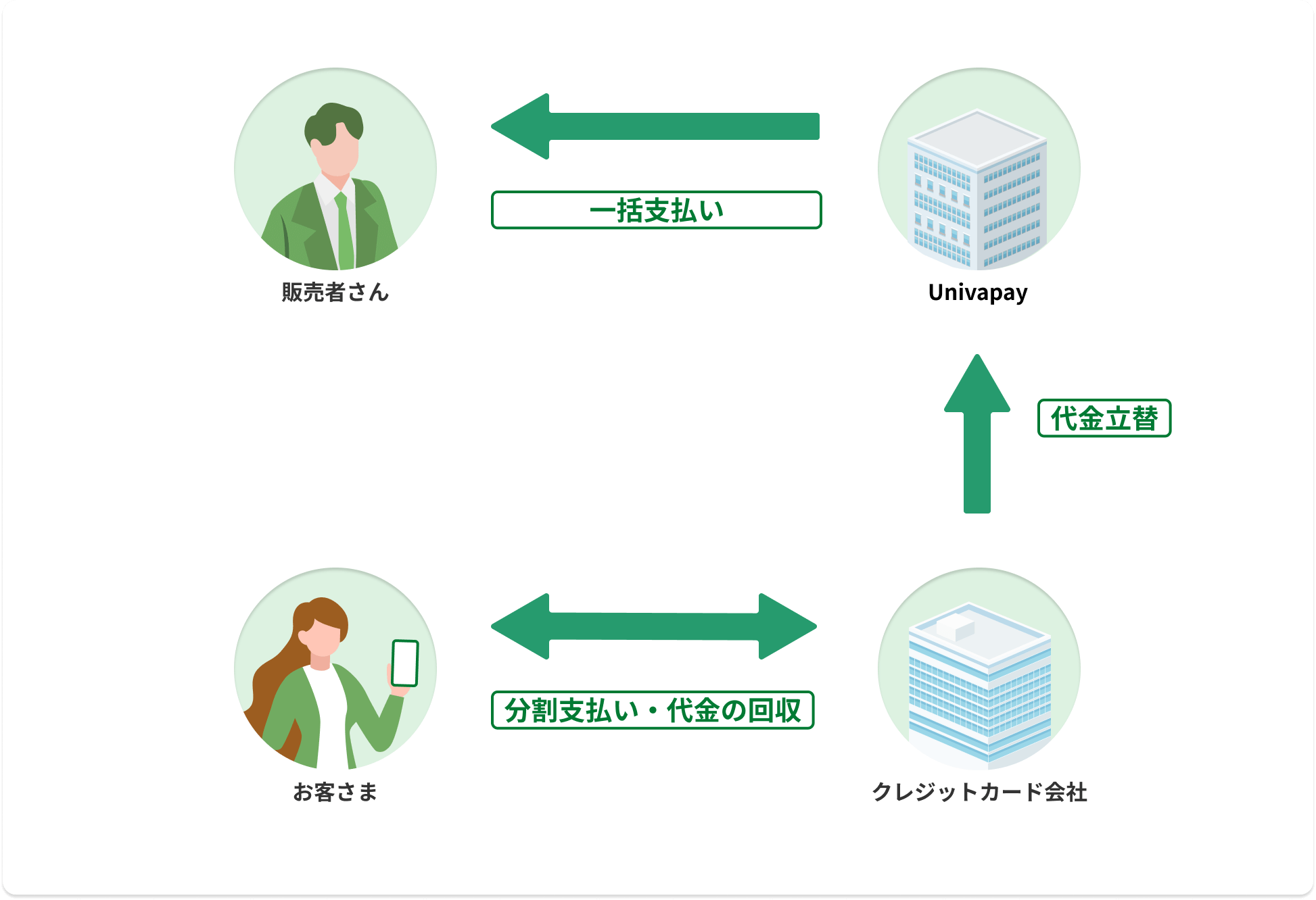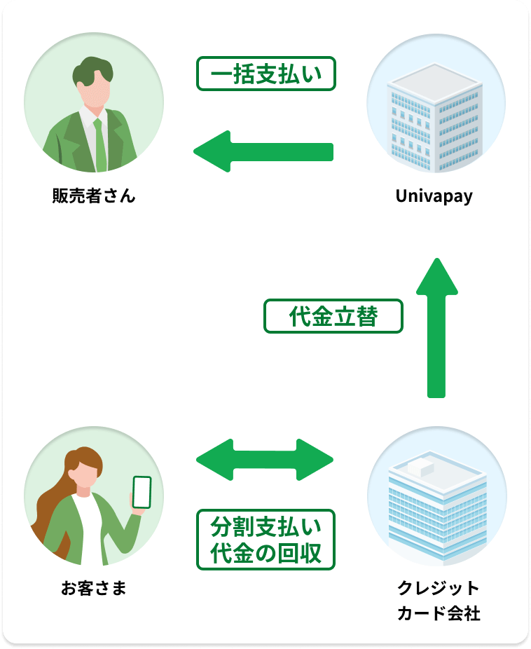 販売者さんには、売上が一括で入金され、お客さまは、分割で購入ができる決済方法になります