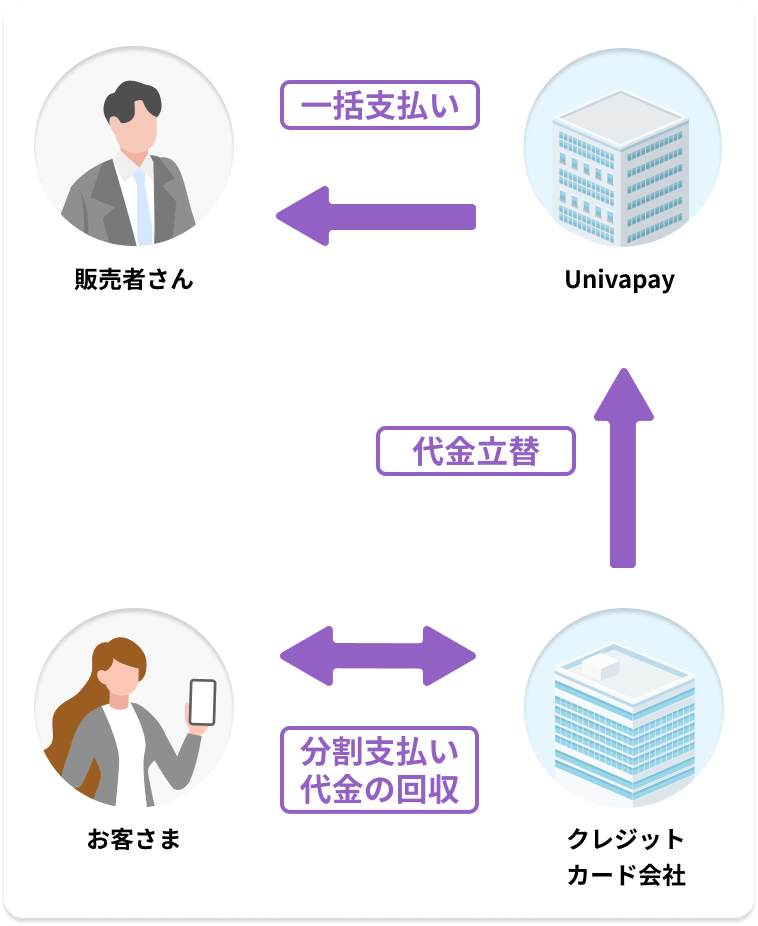 販売者さんには、売上が一括で入金され、お客さまは、分割で購入ができる決済方法になります